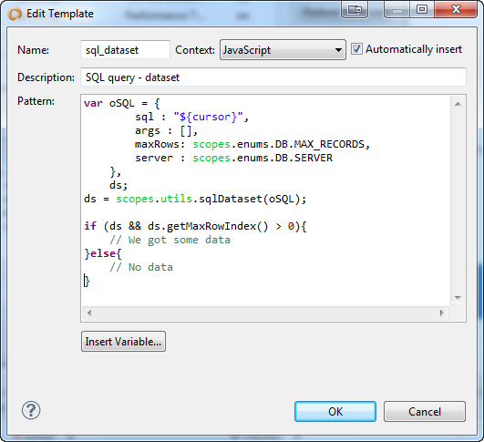 Give the Template a name that you will remember. You will be able to start typing the name, then press CTR + SPACE to get Eclipse to suggest an available auto-completion template. I created myself three templates, one for each of the main functions, sqlDataset, sqlFoundset and sqlRaw. Notice that I use the “Insert Variable” button to place the “${cursor}” in the location I would like my cursor to be after the code is generated by the auto-completion.