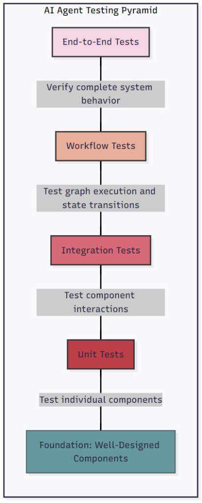 Figure 1: AI Agent Testing Pyramid – This diagram illustrates the hierarchical testing approach for AI agent systems. Starting from unit tests at the base that verify individual components, through integration tests that check component interactions, workflow tests that validate graph execution and state transitions, and finally end-to-end tests at the top that verify complete system behavior. Each layer provides different guarantees and catches different types of issues.