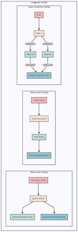 Orchestration Logic in Langgraph requires testing at multiple levels. You need to verify that individual nodes work correctly, that edges route properly based on conditions, and that the overall graph execution produces expected results. This hierarchical testing need requires a structured approach.