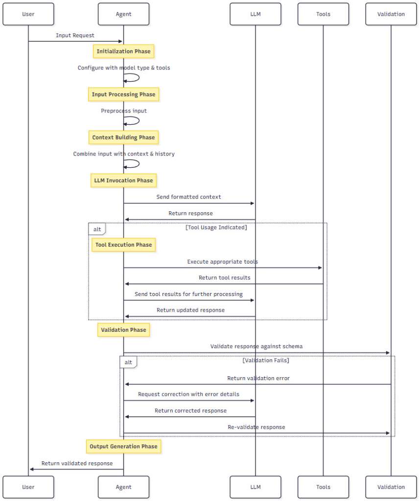 Figure 2: Agent Execution Flow – This diagram shows the step-by-step execution flow of a Pydantic AI agent, from receiving user input to generating a validated response. Each step includes validation checkpoints to ensure reliability.