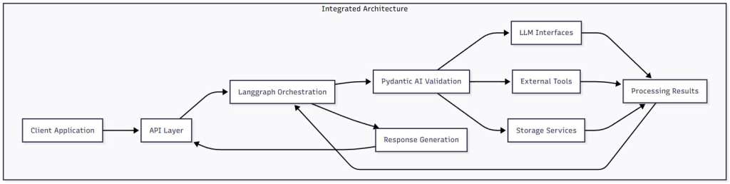 Figure 2: Integrated Architecture – This diagram shows how Langgraph and Pydantic AI work together in a layered architecture. Data flows from the client through Langgraph’s orchestration layer, where Pydantic AI validates all inputs and outputs before they interact with LLMs, tools, or storage systems.