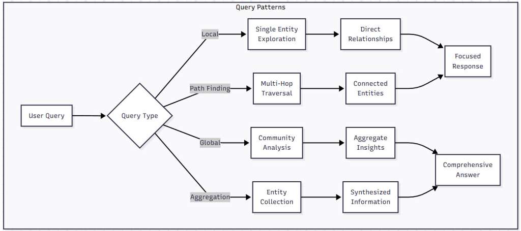Figure 3: Query Patterns in GraphRAG – This flowchart illustrates how different query types (Local, Path Finding, Global, Aggregation) are processed through the graph to generate focused or comprehensive responses. Each pattern leverages different graph traversal strategies.