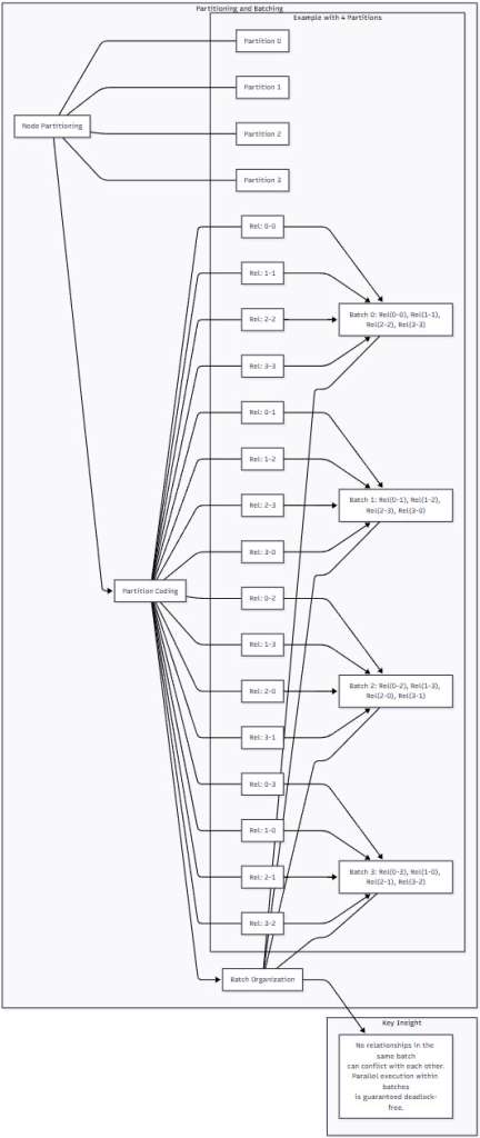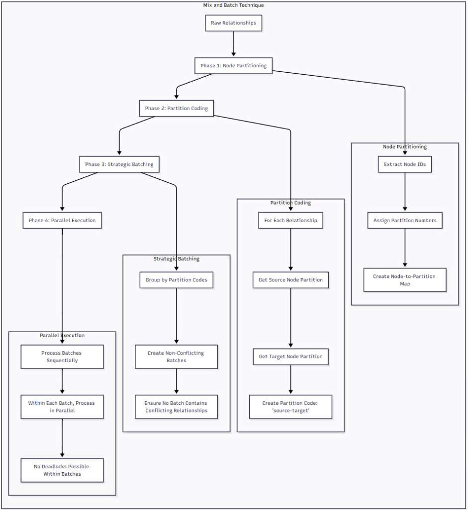 Figure 1: The Mix and Batch Technique Overview – This diagram illustrates the four-phase process of Mix and Batch. Starting with raw relationships, the technique systematically partitions nodes, creates partition codes, organizes relationships into non-conflicting batches, and finally executes them in parallel without any possibility of deadlocks.