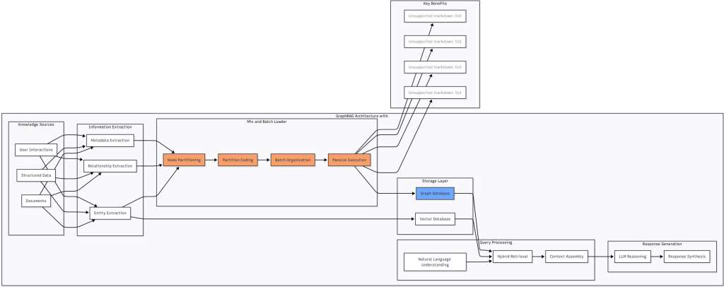 Figure 5: GraphRAG Architecture with Mix and Batch Integration – This diagram shows how Mix and Batch fits into a modern GraphRAG architecture, handling the critical relationship loading phase between extraction and storage. The technique enables efficient parallel loading that would otherwise bottleneck the entire pipeline.