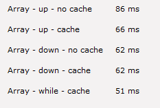 If you read some of the JavaScript books out there, you learn that JavaScript can execute a for loop faster counting down to zero instead of counting up to a number it needs to check each time. So, if we loop down, regardless if we cache the array.length or not, our test loop will run at 62ms.