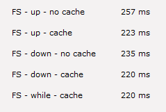 Well, as you can see from the results in Figure 2, even with Servoy foundsets it is still important to cache the foundset.getSize()in a variable before your for loop(you don’t want it looking up that value with each iteration of the loop), but it doesn’t seem to matter quite as much if you are counting up or counting down.This is probably due to the fact that it takes a substantial amount of time for getRecord() to execute, so savings obtained from JavaScript counting down are lost. Furthermore, caching the foundset size before the loop can have a much bigger affect then the summary shown in Figure 2. With repeated testing, sometimes the loop using no cache can be more than 100ms greater than the loop that does use the cache. I’m not sure of the reasons behind this, but Figure 2 shows the best result for the loop with no cache.